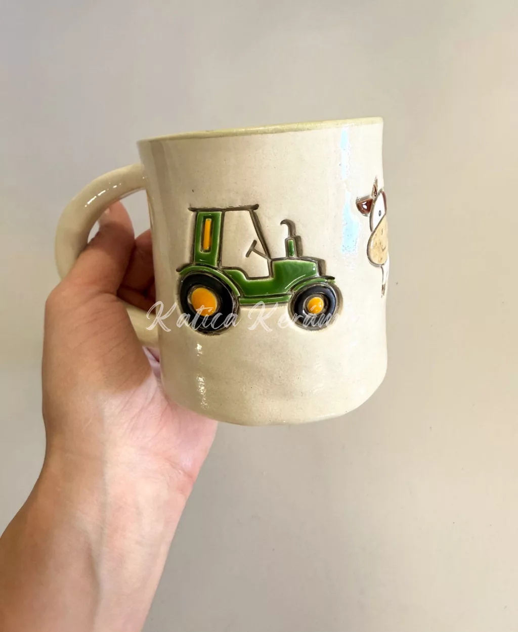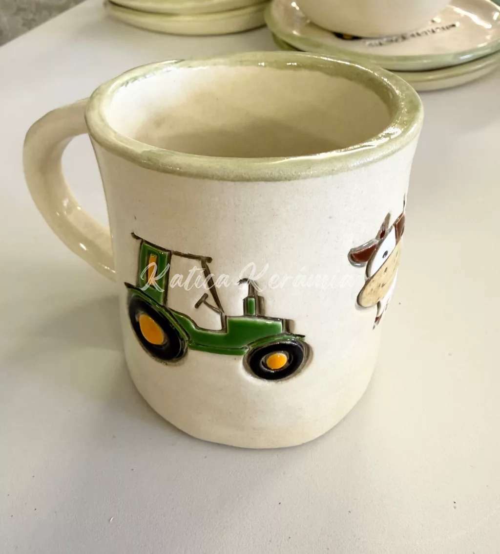 A kollekcióban kb. 18 cm-es lapos tányérok és kb 13-15 cm-es mély tányérok is megtalálhatók, valamint bögrék, melyeket bájos farmállatok díszítenek: lovas, bárányos, bocis és malacos mintákkal. A zöld szegély és a természetes, rusztikus kerámia színvilág még otthonosabbá teszi az összhatást.