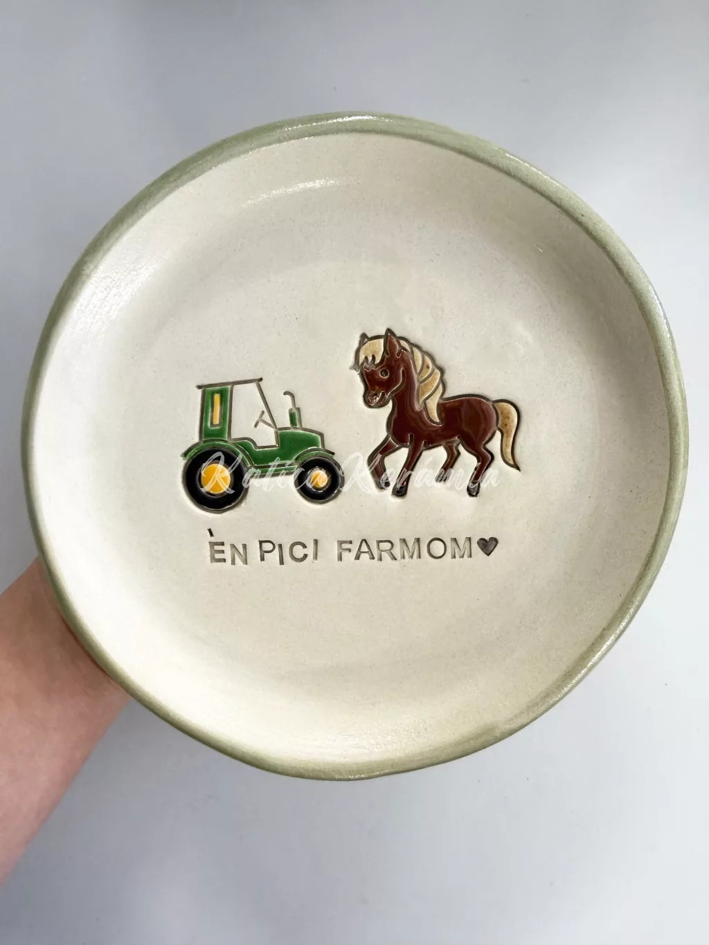Vidám, kézzel készült és kézzel festett kerámia tányérszett, amely a farmok kedves világát hozza el a mindennapokba. Minden darab egyedi, aprólékosan kidolgozott mintával készül, így nincs két teljesen egyforma darab.