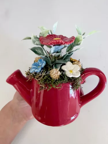 • kerámia kannába rögzített kerámia virágok, levelek, termések kompozíciója