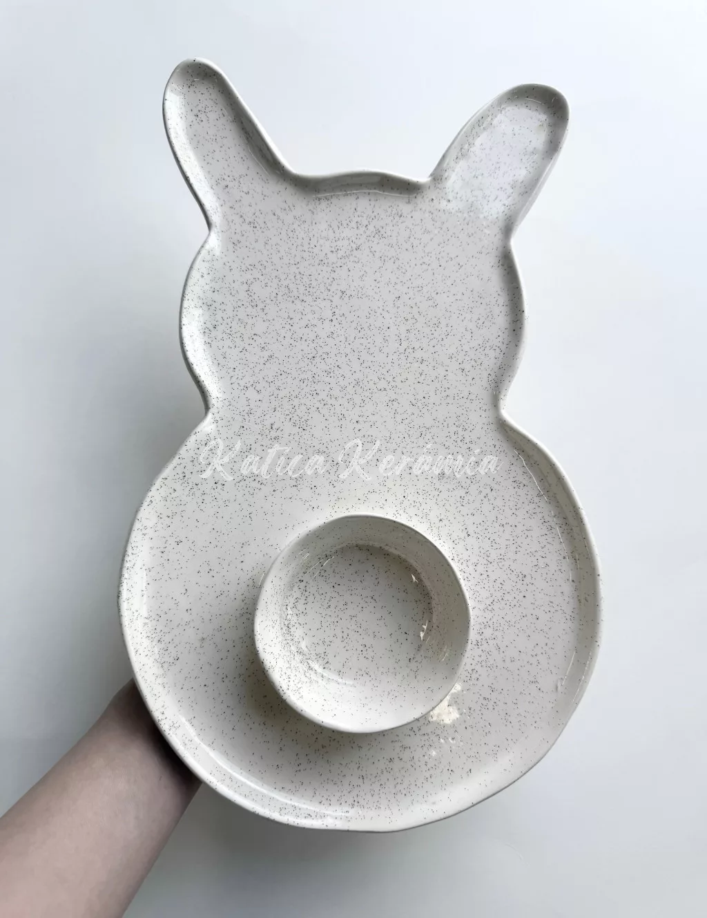 Kézzel készített és festett nagy nyuszis szószos tányér. Kb 33X20 cm.