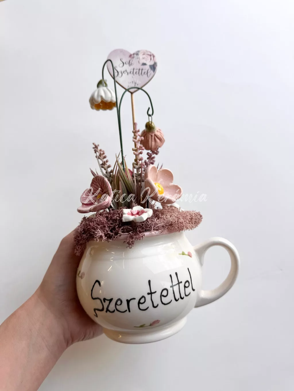 Ez a különleges, kézzel készült asztali dísz egyedi ajándék lehet bármilyen alkalomra – legyen szó születésnapról, névnapról, anyák napjáról, vagy csak egy kedves meglepetésről. Szeretettl felíratú kerámia bögre kedves hangulatot áraszt, melyet gondosan összeállított kerámia virágok és természetes mohaborítás tesz teljessé.