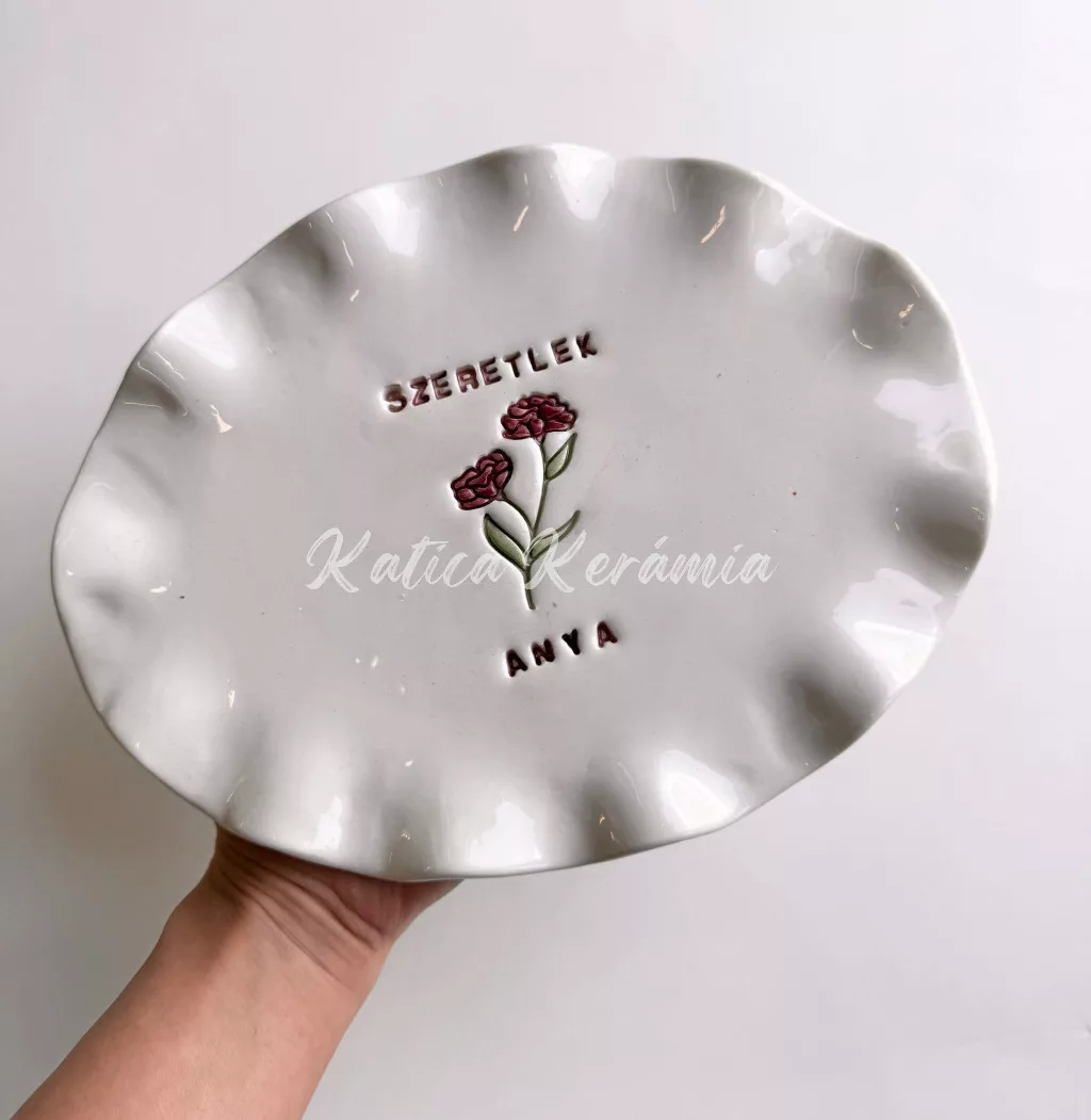 Kézzel készített és festett Szeretlek Anya feliratú tányér. Kb 22-23 cm széles.