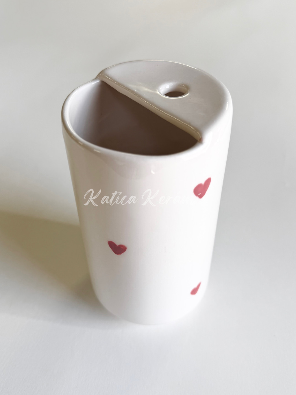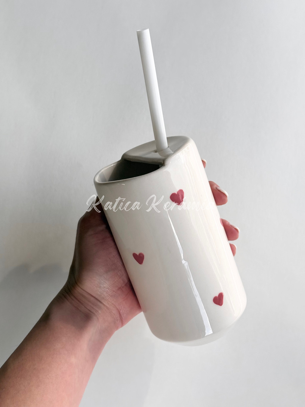 Ez a 4 dl-es, kézzel készített kerámia pohár apró, kézzel festett szívecskékkel díszített, így minden darab egyedi és megismételhetetlen.